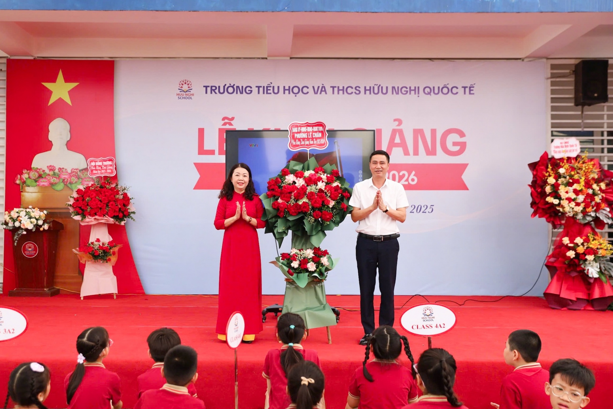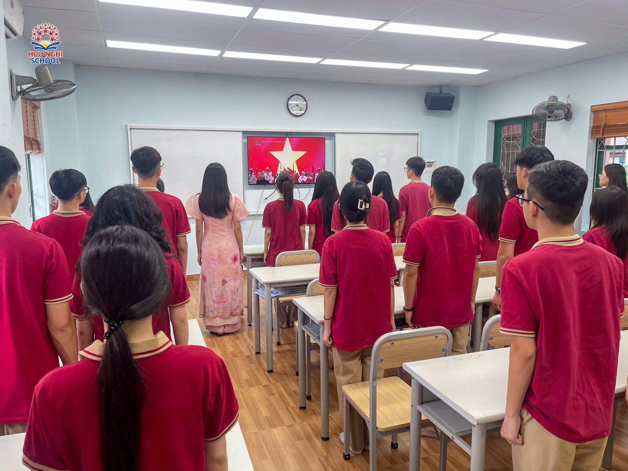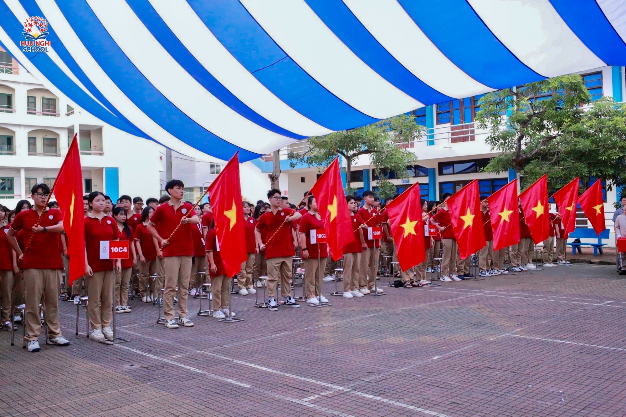 Buổi lễ Khai giảng bắt đầu với nghi thức chào cờ trang nghiêm và lắng đọng. Trong không khí thiêng liêng ấy, thầy và trò HNS cùng nhau nhìn lại chặng đường 80 năm phát triển của ngành Giáo dục Việt Nam. Từ những ngày đầu tiên non trẻ, ngành đã không ngừng lớn mạnh, đóng góp to lớn vào sự nghiệp giải phóng dân tộc và xây dựng đất nước. Sự hy sinh thầm lặng của biết bao thế hệ nhà giáo đã vun đắp nên những giá trị tri thức, đạo đức, chắp cánh cho hàng triệu thế hệ học sinh Việt Nam.